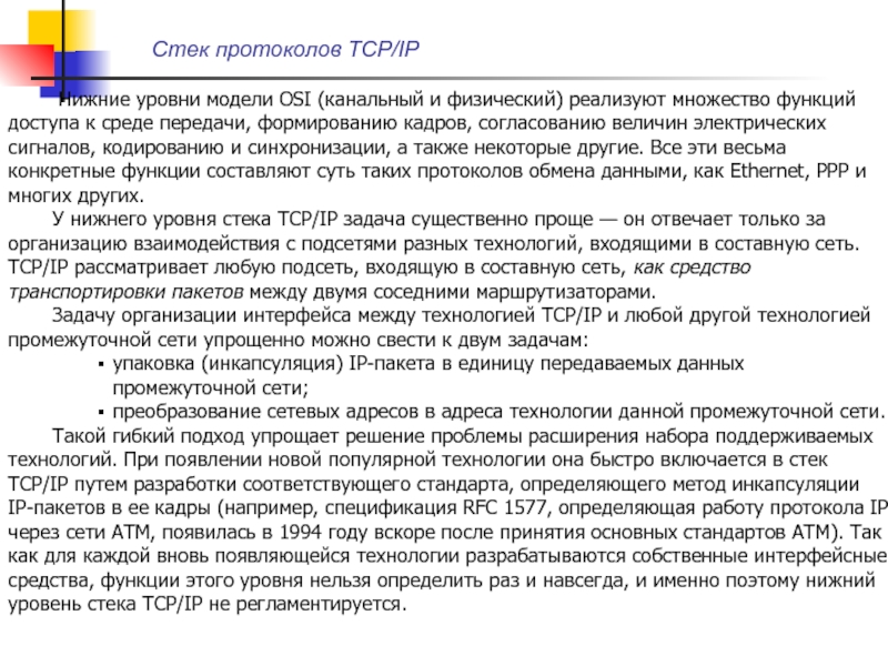 Такой гибкий подход упрощает решение проблемы расширения набора поддерживаемых технологий. При появлении новой популярной технологии она быстро включается в стек TCP/IP путем разработки соответствующего стандарта, определяющего метод инкапсуляции IP-пакетов в ее кадры (например, спецификация RFC 1577, определяющая работу протокола IP через сети ATM, появилась в 1994 году вскоре после принятия основных стандартов ATM). Так как для каждой вновь появляющейся технологии разрабатываются собственные интерфейсные средства, функции этого уровня нельзя определить раз и навсегда, и именно поэтому нижний уровень стека TCP/IP не регламентируется.