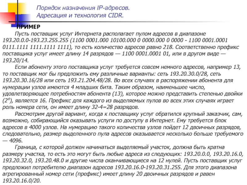 располагает пулом адресов в диапазоне 193.20.0.0-193.23.255.255 (1100 0001.000 10100.000 0 0000.000 0 0000 - 1100 0001.0001 0111.1111 1111.1111 1111), то есть количество адресов равно 218. Соответственно префикс поставщика услуг имеет длину 14 разрядов — 1100 0001.0001 01, или в другом виде — 193.20/14.