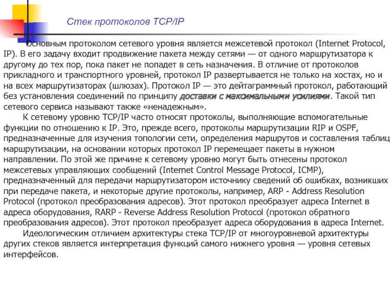 В его задачу входит продвижение пакета между сетями — от одного маршрутизатора к другому до тех пор, пока пакет не попадет в сеть назначения. В отличие от протоколов прикладного и транспортного уровней, протокол IP развертывается не только на хостах, но и на всех маршрутизаторах (шлюзах). Протокол IP — это дейтаграммный протокол, работающий без установления соединений по принципу доставки с максимальными усилиями. Такой тип сетевого сервиса называют также «ненадежным».