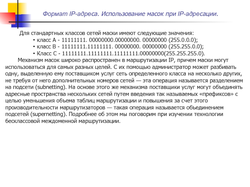 Механизм масок широко распространен в маршрутизации IP, причем маски могут использоваться для самых разных целей. С их помощью администратор может разбивать одну, выделенную ему поставщиком услуг сеть определенного класса на несколько других, не требуя от него дополнительных номеров сетей — эта операция называется разделением на подсети (subnetting). На основе этого же механизма поставщики услуг могут объединять адресные пространства нескольких сетей путем введения так называемых «префиксов» с целью уменьшения объема таблиц маршрутизации и повышения за счет этого производительности маршрутизаторов — такая операция называется объединением подсетей (supernetting). Подробнее об этом мы поговорим при изучении технологии бесклассовой междоменной маршрутизации.