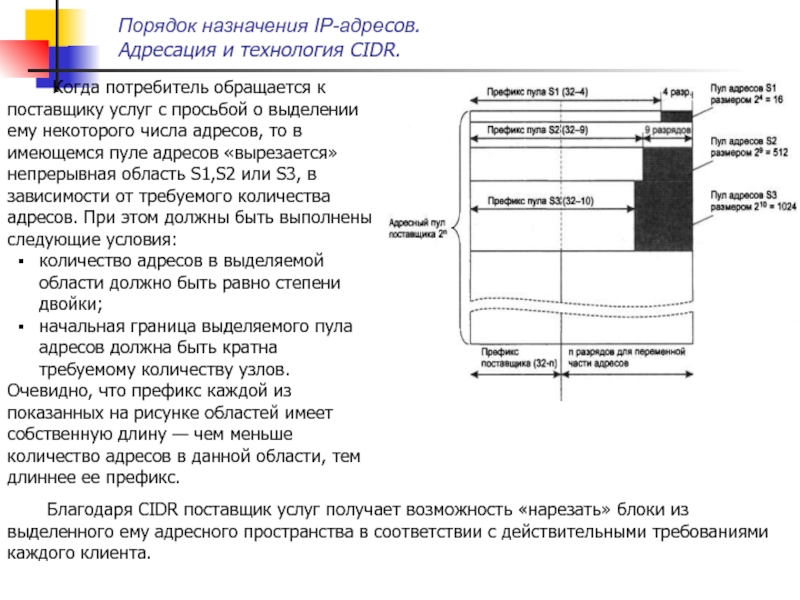 Благодаря CIDR поставщик услуг получает возможность «нарезать» блоки из выделенного ему адресного пространства в соответствии с действительными требованиями каждого клиента.