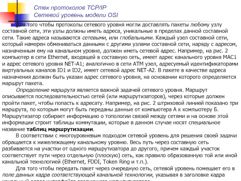 узлу составной сети, эти узлы должны иметь адреса, уникальные в пределах данной составной сети. Такие адреса называются сетевыми, или глобальными. Каждый узел составной сети, который намерен обмениваться данными с другими узлами составной сети, наряду с адресом, назначенным ему на канальном уровне, должен иметь сетевой адрес. Например, на рис. 2 компьютер в сети Ethernet, входящей в составную сеть, имеет адрес канального уровня МАС1 и адрес сетевого уровня NET-A1; аналогично в сети ATM узел, адресуемый идентификаторами виртуальных каналов ID1 и ID2, имеет сетевой адрес NET-A2. В пакете в качестве адреса назначения должен быть указан адрес сетевого уровня, на основании которого определяется маршрут пакета.
