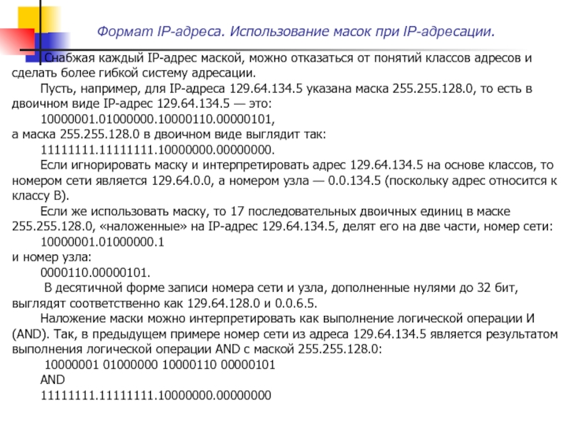 Пусть, например, для IP-адреса 129.64.134.5 указана маска 255.255.128.0, то есть в двоичном виде IP-адрес 129.64.134.5 — это: