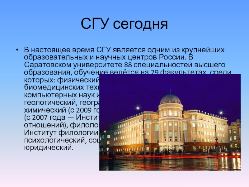 научных центров России. В Саратовском университете 88 специальностей высшего образования, обучение ведётся на 29 факультетах, среди которых: физический, нелинейных процессов, нано- и биомедицинских технологий, механико-математический, компьютерных наук и информационных технологий, геологический, географический, биологический, химический (с 2009 года - Институт химии), исторический (с 2007 года — Институт истории и международных отношений), филологии и журналистики (с 2007 года — Институт филологии и журналистики), философский, психологический, социологический, экономический, юридический.
