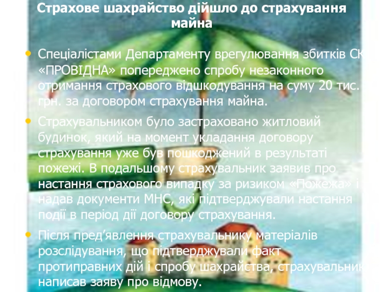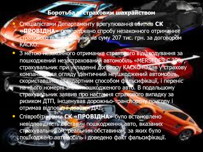 Слайд 31Спеціалістами Департаменту врегулювання збитків СК «ПРОВІДНА» попереджена спроба незаконного отримання страхового