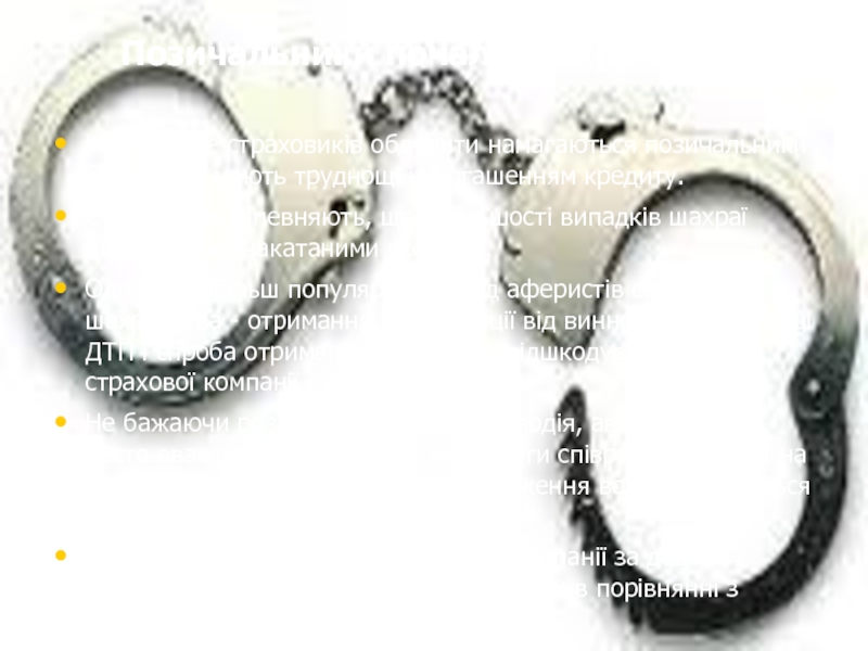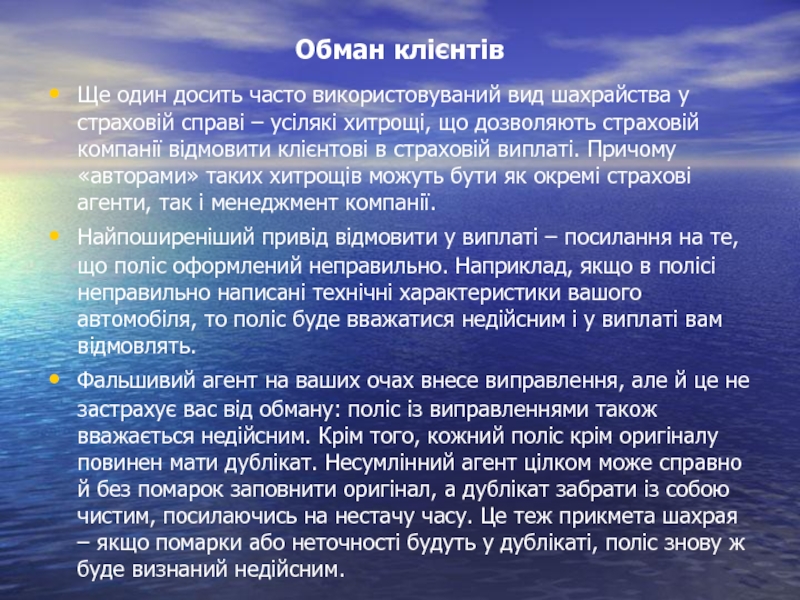 – усілякі хитрощі, що дозволяють страховій компанії відмовити клієнтові в страховій виплаті. Причому «авторами» таких хитрощів можуть бути як окремі страхові агенти, так і менеджмент компанії.