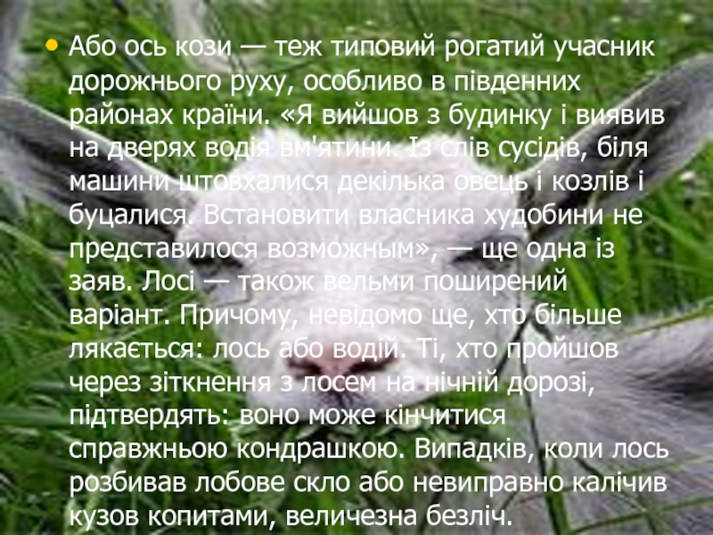 в південних районах країни. «Я вийшов з будинку і виявив на дверях водія вм'ятини. Із слів сусідів, біля машини штовхалися декілька овець і козлів і буцалися. Встановити власника худобини не представилося возможным», — ще одна із заяв. Лосі — також вельми поширений варіант. Причому, невідомо ще, хто більше лякається: лось або водій. Ті, хто пройшов через зіткнення з лосем на нічній дорозі, підтвердять: воно може кінчитися справжньою кондрашкою. Випадків, коли лось розбивав лобове скло або невиправно калічив кузов копитами, величезна безліч.