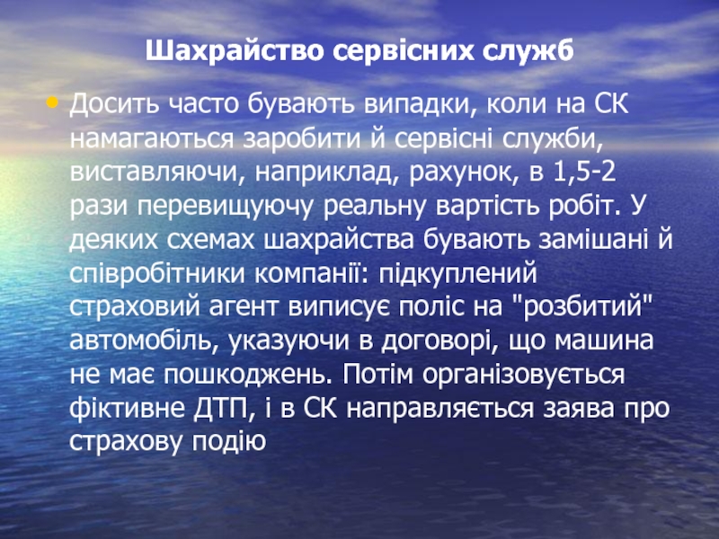 й сервісні служби, виставляючи, наприклад, рахунок, в 1,5-2 рази перевищуючу реальну вартість робіт. У деяких схемах шахрайства бувають замішані й співробітники компанії: підкуплений страховий агент виписує поліс на "розбитий" автомобіль, указуючи в договорі, що машина не має пошкоджень. Потім організовується фіктивне ДТП, і в СК направляється заява про страхову подію