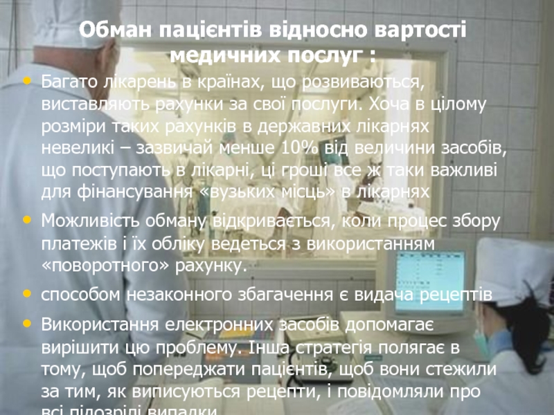 Слайд 38Обман пацієнтів відносно вартості медичних послуг :