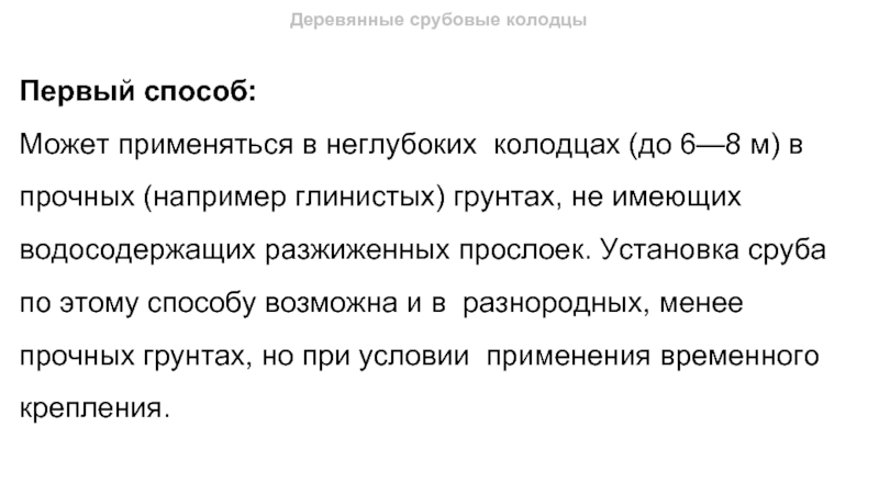 в прочных (например глинистых) грунтах, не имеющих водосодержащих разжиженных прослоек. Установка сруба по этому способу возможна и в разнородных, менее прочных грунтах, но при условии применения временного крепления.