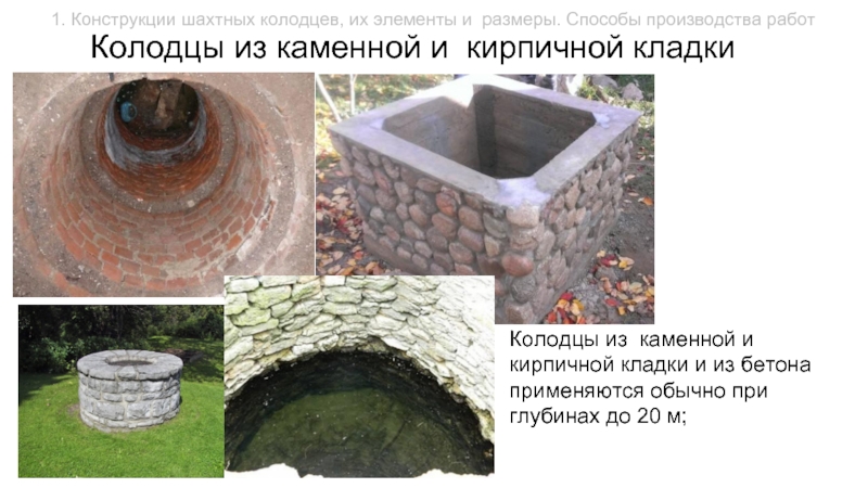 Колодцы из каменной и кирпичной кладки и из бетона применяются обычно при глубинах до 20 м;
