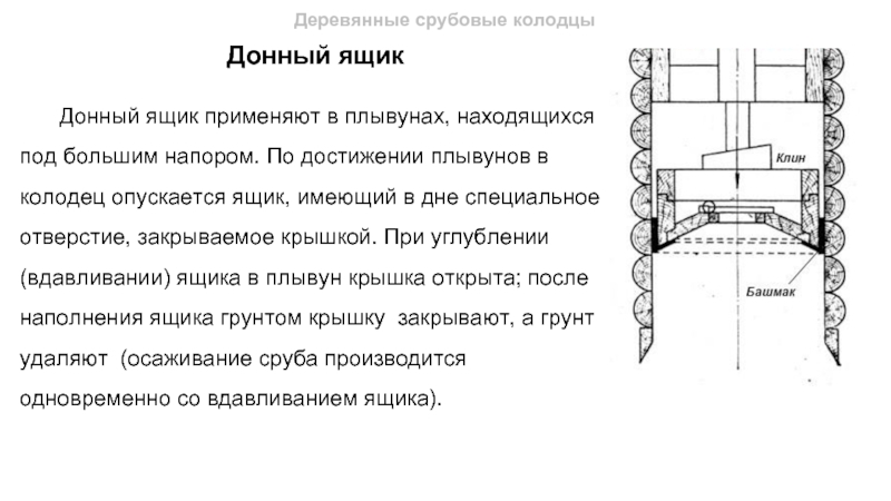 большим напором. По достижении плывунов в колодец опускается ящик, имеющий в дне специальное отверстие, закрываемое крышкой. При углублении (вдавливании) ящика в плывун крышка открыта; после наполнения ящика грунтом крышку закрывают, а грунт удаляют (осаживание сруба производится одновременно со вдавливанием ящика).