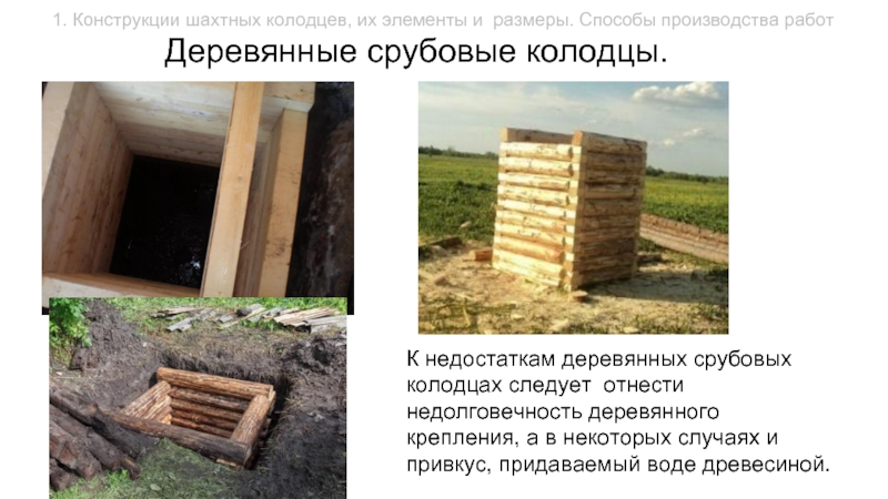 К недостаткам деревянных срубовых колодцах следует отнести недолговечность деревянного крепления, а в некоторых случаях и привкус, придаваемый воде древесиной.
