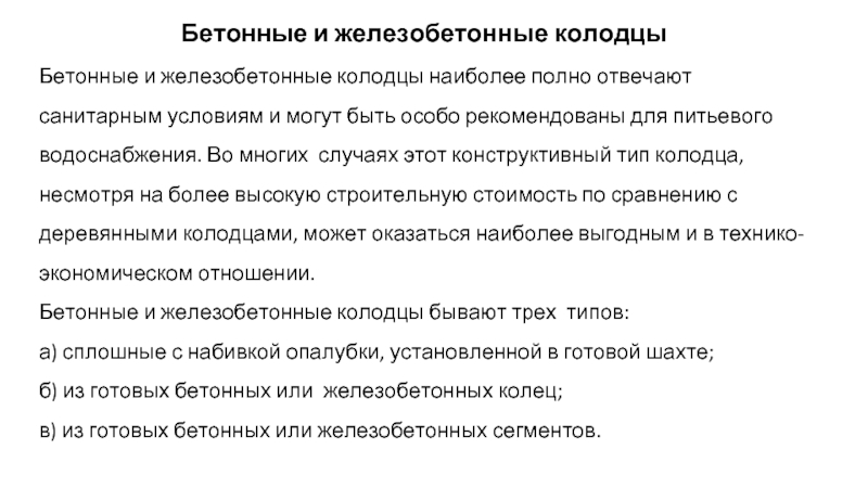 условиям и могут быть особо рекомендованы для питьевого водоснабжения. Во многих случаях этот конструктивный тип колодца, несмотря на более высокую строительную стоимость по сравнению с деревянными колодцами, может оказаться наиболее выгодным и в технико-экономическом отношении.