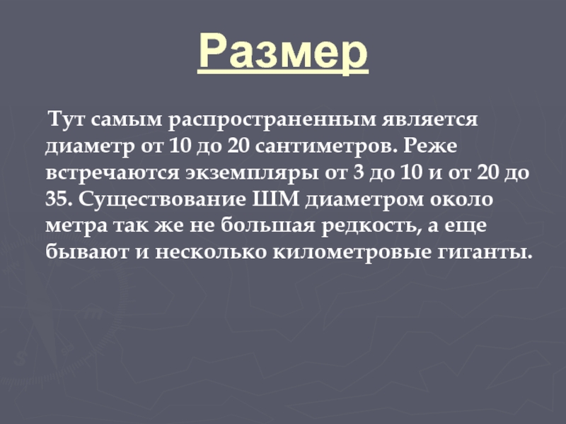 20 сантиметров. Реже встречаются экземпляры от 3 до 10 и от 20 до 35. Существование ШМ диаметром около метра так же не большая редкость, а еще бывают и несколько километровые гиганты.