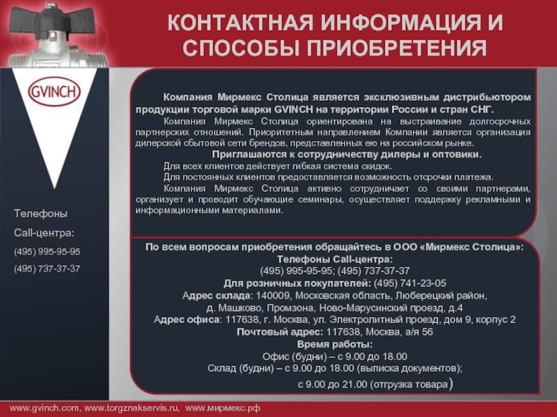 Компания Мирмекс Столица является эксклюзивным дистрибьютором продукции торговой марки GVINCH на территории России и стран СНГ.