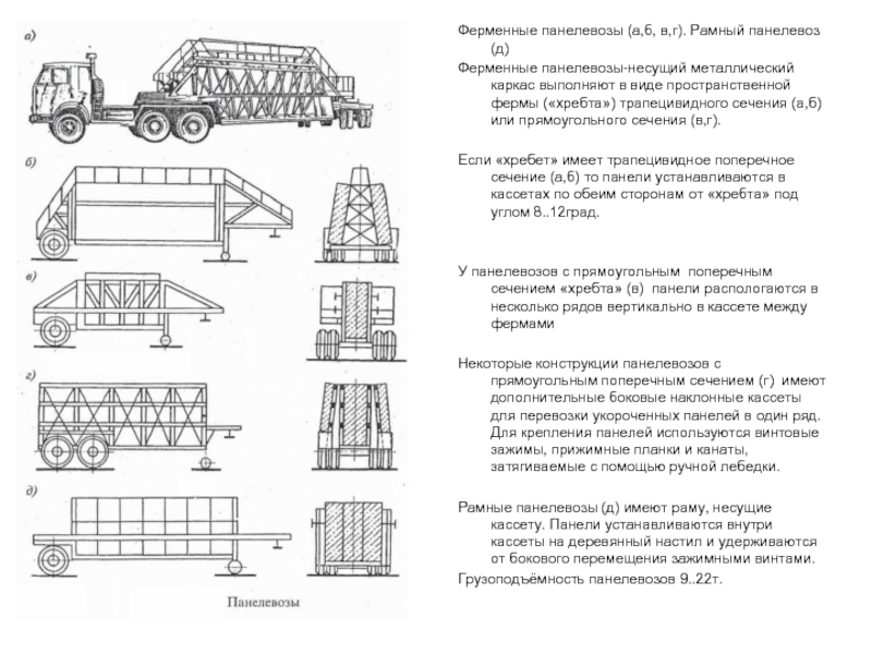 Слайд 14Ферменные панелевозы (а,б, в,г). Рамный панелевоз (д)