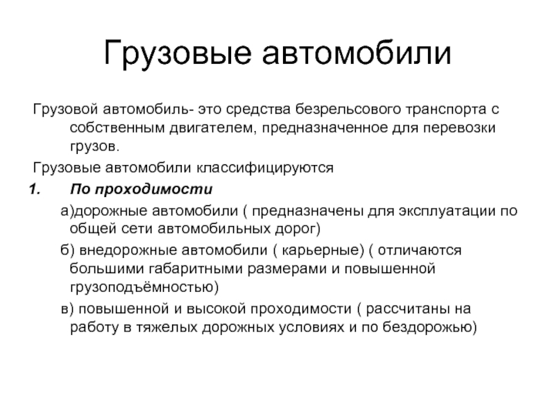 Грузовой автомобиль- это средства безрельсового транспорта с собственным двигателем, предназначенное