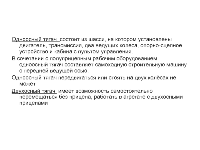 Слайд 28Одноосный тягач состоит из шасси, на котором установлены двигатель, трансмиссия, два