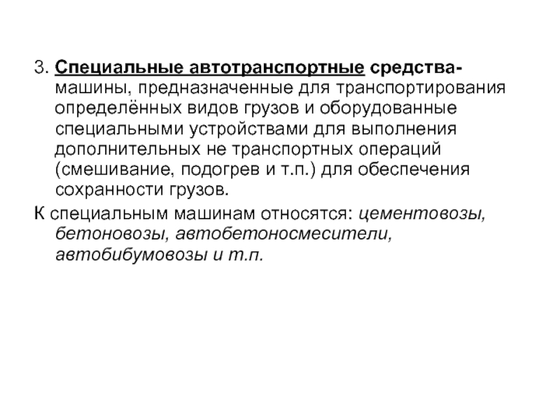 3. Специальные автотранспортные средства- машины, предназначенные для транспортирования определённых видов грузов