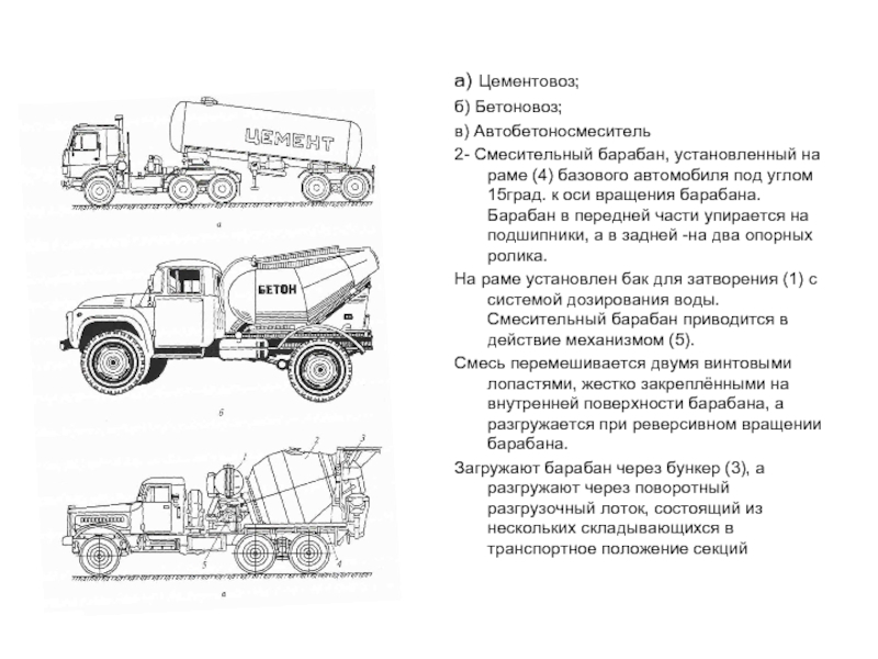 раме (4) базового автомобиля под углом 15град. к оси вращения барабана. Барабан в передней части упирается на подшипники, а в задней -на два опорных ролика.