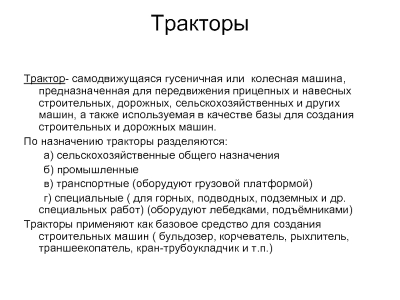 Тракторы применяют как базовое средство для создания строительных машин ( бульдозер, корчеватель, рыхлитель, траншеекопатель, кран-трубоукладчик и т.п.)