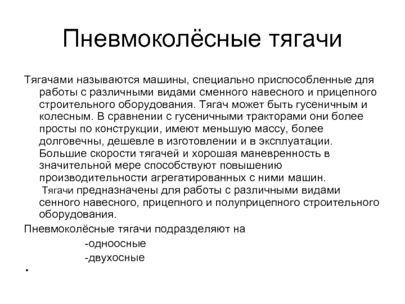 сменного навесного и прицепного строительного оборудования. Тягач может быть гусеничным и колесным. В сравнении с гусеничными тракторами они более просты по конструкции, имеют меньшую массу, более долговечны, дешевле в изготовлении и в эксплуатации. Большие скорости тягачей и хорошая маневренность в значительной мере способствуют повышению производительности агрегатированных с ними машин.