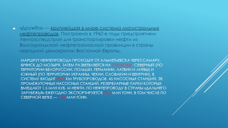 «Дружба» — крупнейшая в мире система магистральных нефтепроводов. Построена в 1960 е годы предприятием Ленгазспецстрой для транспортировки нефти из Волгоуральской нефтегазоносной провинции в страны народной демократии Восточной Европы.