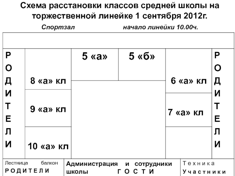 Слайд 2Схема расстановки классов средней школы на торжественной линейке 1 сентября 2012г. Спортзал