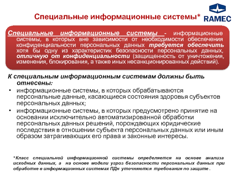 *Класс специальной информационной системы определяется на основе анализа исходных данных, а на основе модели угроз безопасности персональных данных при обработке в информационных системах ПДн уточняются требования по защите .