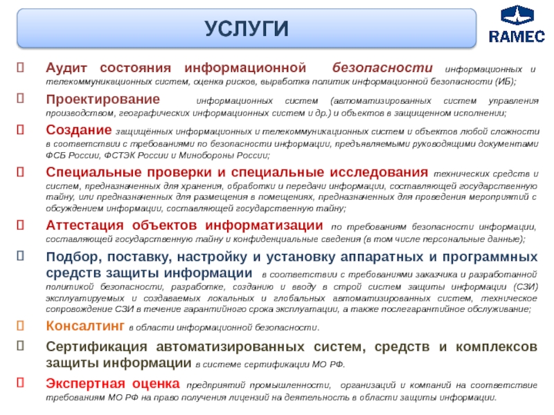 ЗАО «РАМЭК-ВС» выполняет полный комплекс работ по созданию систем защиты ИСПДн и руководствуется экономической целесообразностью и эффективностью мер, обеспечивающих выполнение требований безопасности информации.