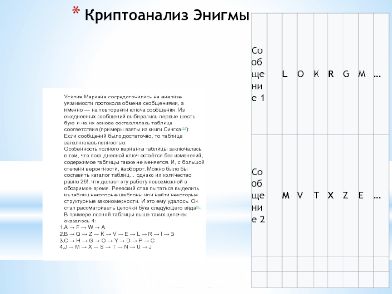 именно — на повторении ключа сообщения. Из ежедневных сообщений выбирались первые шесть букв и на их основе составлялась таблица соответствия (примеры взяты из книги Сингха[6]):