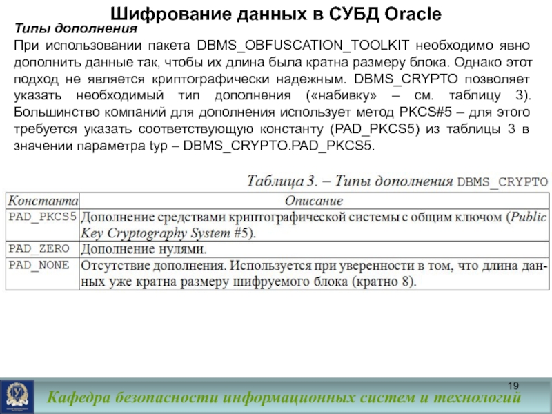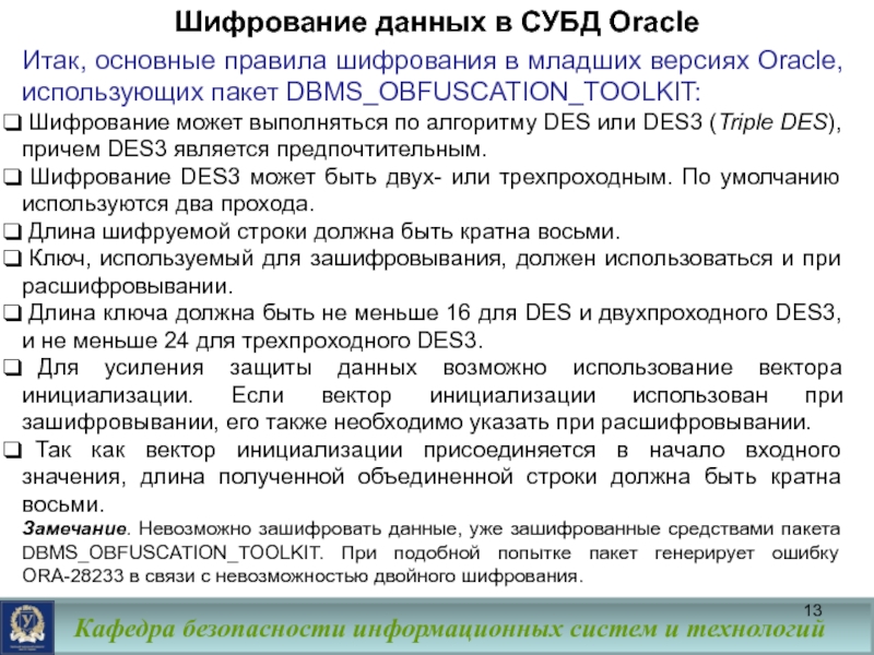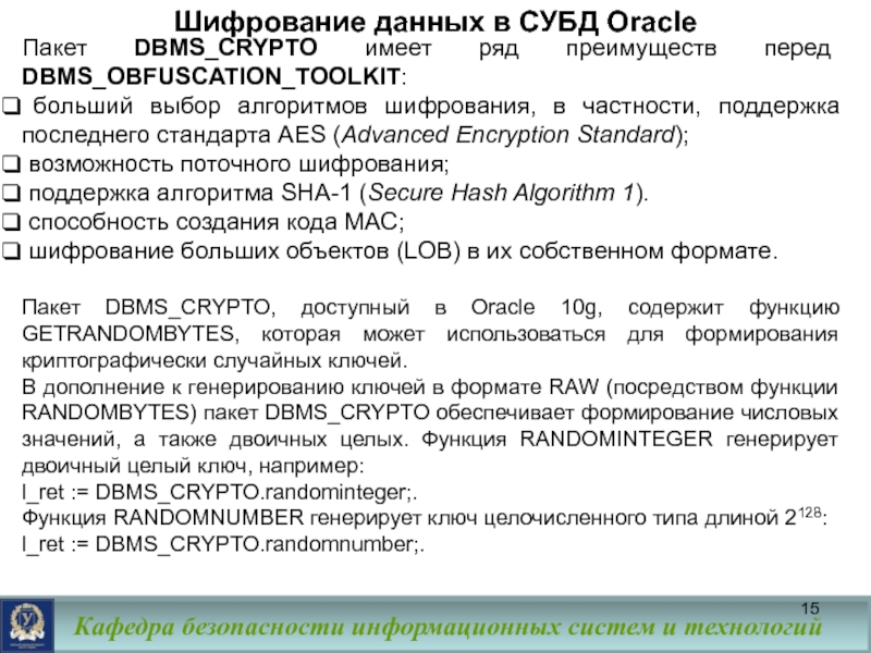 пакета DBMS_OBFUSCATION_TOOLKIT должны выполняться следующие требования: