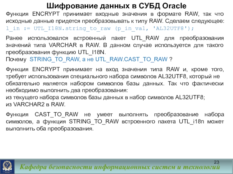 среди подпрограмм шифрования в версии Oracle 8.1.7 есть функции. Однако эти функции перегружены так, что использовать их в SQL-операторах тоже нельзя;