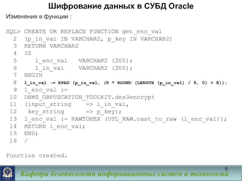 9 DBMS_OUTPUT.put_line ('Encrypted Value = ' || l_enc_val);