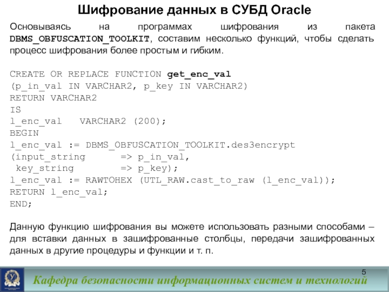Основываясь на программах шифрования из пакета DBMS_OBFUSCATION_TOOLKIT,