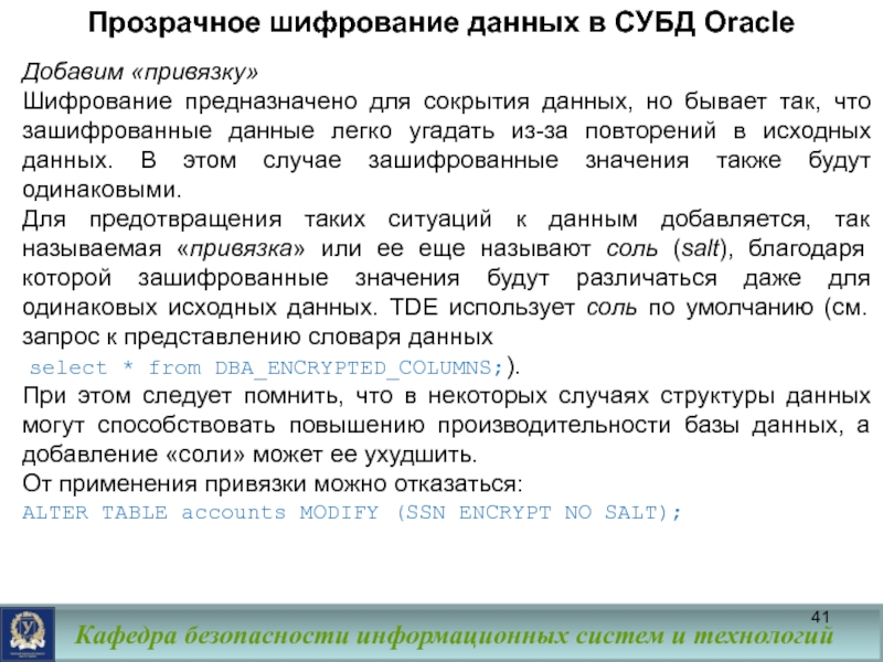 Для предотвращения таких ситуаций к данным добавляется, так называемая «привязка» или ее еще называют соль (salt), благодаря которой зашифрованные значения будут различаться даже для одинаковых исходных данных. TDE использует соль по умолчанию (см. запрос к представлению словаря данных