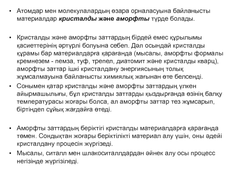 Слайд 7Атомдар мен молекулалардың өзара орналасуына байланысты материалдар кристалды және аморфты түрде