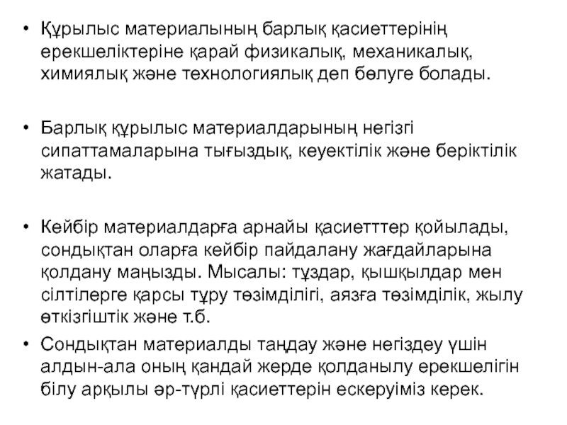 Слайд 3Құрылыс материалының барлық қасиеттерінің ерекшеліктеріне қарай физикалық, механикалық, химиялық және технологиялық