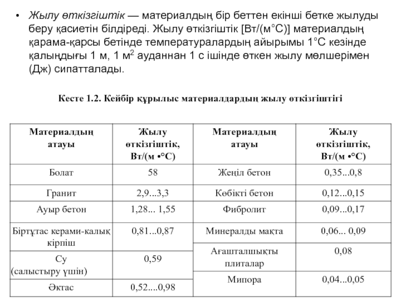 Кесте 1.2. Кейбір құрылыс материалдардың жылу өткізгіштігі