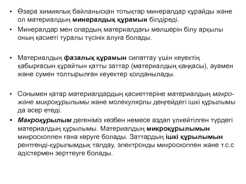 Слайд 4Құрылыс материалдары химиялық, минералды және фазалық құрамымен сипатталады.
