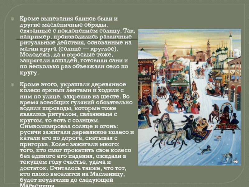 солнцу. Так, например, производились различные ритуальные действия, основанные на магии круга (солнце — круглое). Молодежь, да и взрослые тоже, запрягали лошадей, готовили сани и по несколько раз объезжали село по кругу.