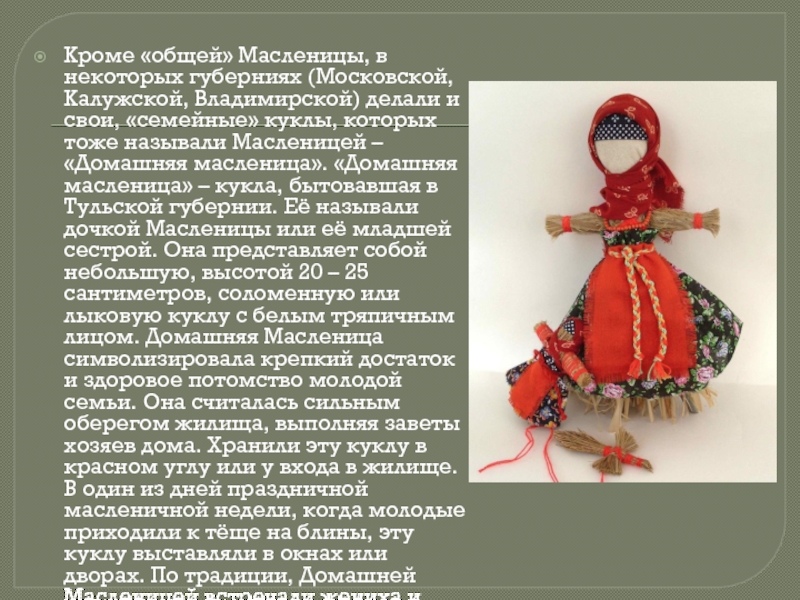 свои, «семейные» куклы, которых тоже называли Масленицей – «Домашняя масленица». «Домашняя масленица» – кукла, бытовавшая в Тульской губернии. Её называли дочкой Масленицы или её младшей сестрой. Она представляет собой небольшую, высотой 20 – 25 сантиметров, соломенную или лыковую куклу с белым тряпичным лицом. Домашняя Масленица символизировала крепкий достаток и здоровое потомство молодой семьи. Она считалась сильным оберегом жилища, выполняя заветы хозяев дома. Хранили эту куклу в красном углу или у входа в жилище. В один из дней праздничной масленичной недели, когда молодые приходили к тёще на блины, эту куклу выставляли в окнах или дворах. По традиции, Домашней Масленицей встречали жениха и невесту.