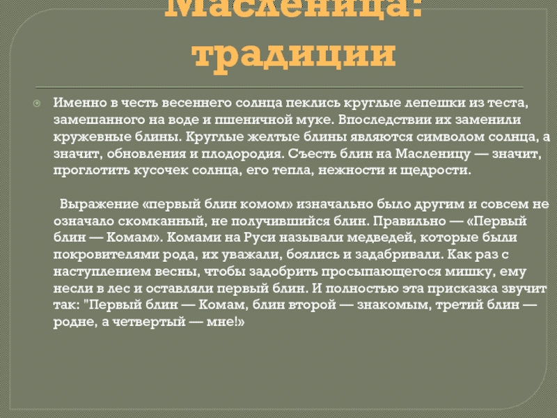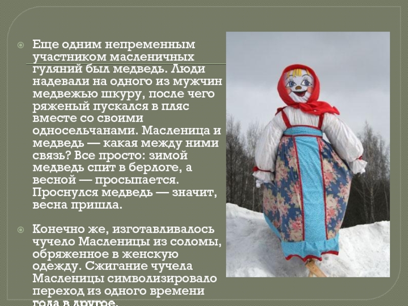 одного из мужчин медвежью шкуру, после чего ряженый пускался в пляс вместе со своими односельчанами. Масленица и медведь — какая между ними связь? Все просто: зимой медведь спит в берлоге, а весной — просыпается. Проснулся медведь — значит, весна пришла.