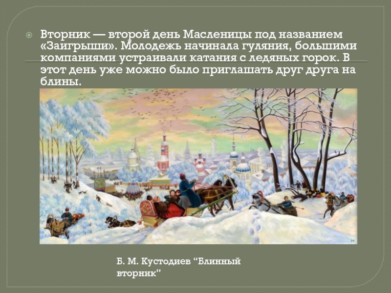 Слайд 9Вторник — второй день Масленицы под названием «Заигрыши». Молодежь начинала гуляния,
