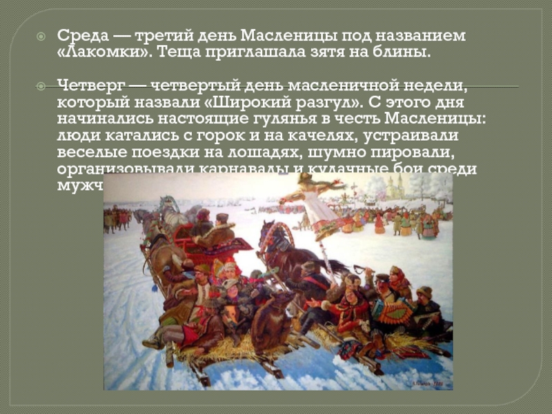 Слайд 10Среда — третий день Масленицы под названием «Лакомки». Теща приглашала зятя