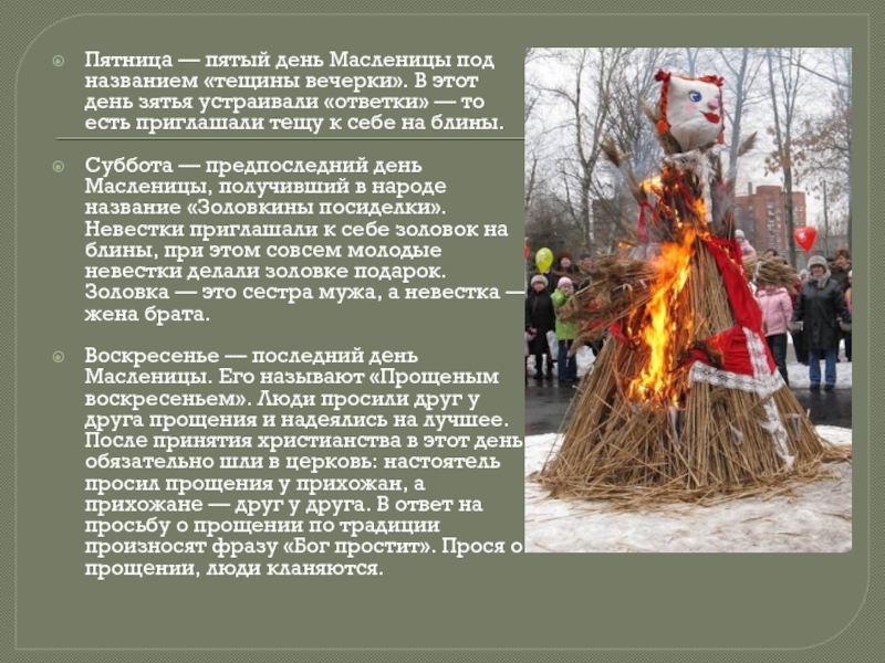 Слайд 11Пятница — пятый день Масленицы под названием «тещины вечерки». В этот