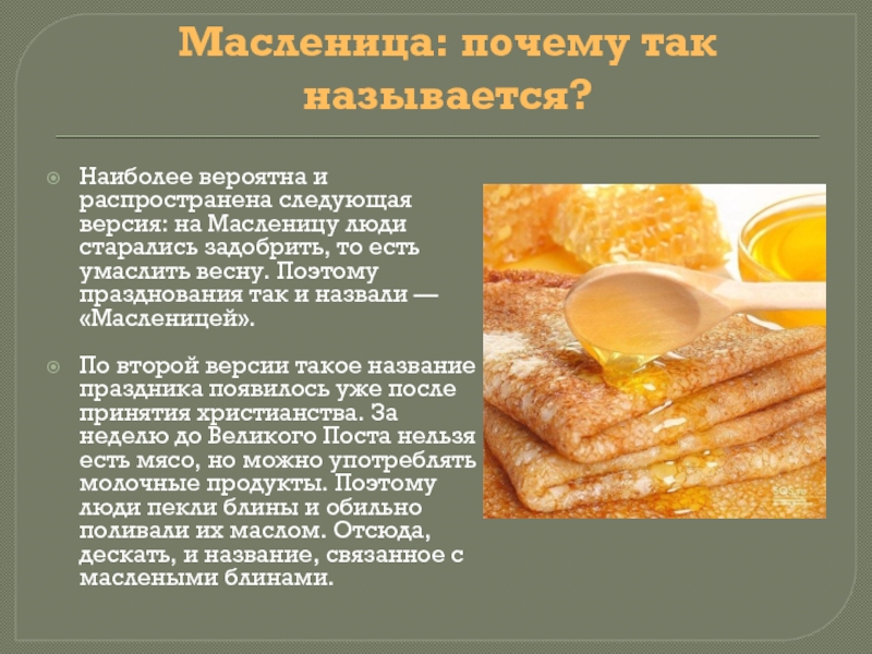 По второй версии такое название праздника появилось уже после принятия христианства. За неделю до Великого Поста нельзя есть мясо, но можно употреблять молочные продукты. Поэтому люди пекли блины и обильно поливали их маслом. Отсюда, дескать, и название, связанное с маслеными блинами.