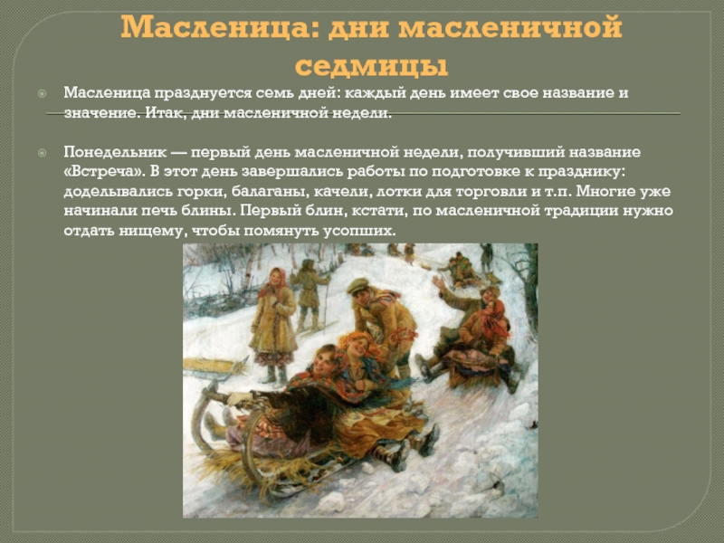 Понедельник — первый день масленичной недели, получивший название «Встреча». В этот день завершались работы по подготовке к празднику: доделывались горки, балаганы, качели, лотки для торговли и т.п. Многие уже начинали печь блины. Первый блин, кстати, по масленичной традиции нужно отдать нищему, чтобы помянуть усопших.