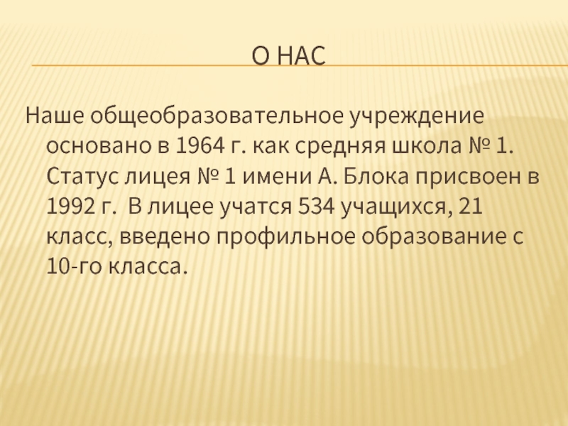 школа № 1. Статус лицея № 1 имени А. Блока присвоен в 1992 г. В лицее учатся 534 учащихся, 21 класс, введено профильное образование с 10-го класса.